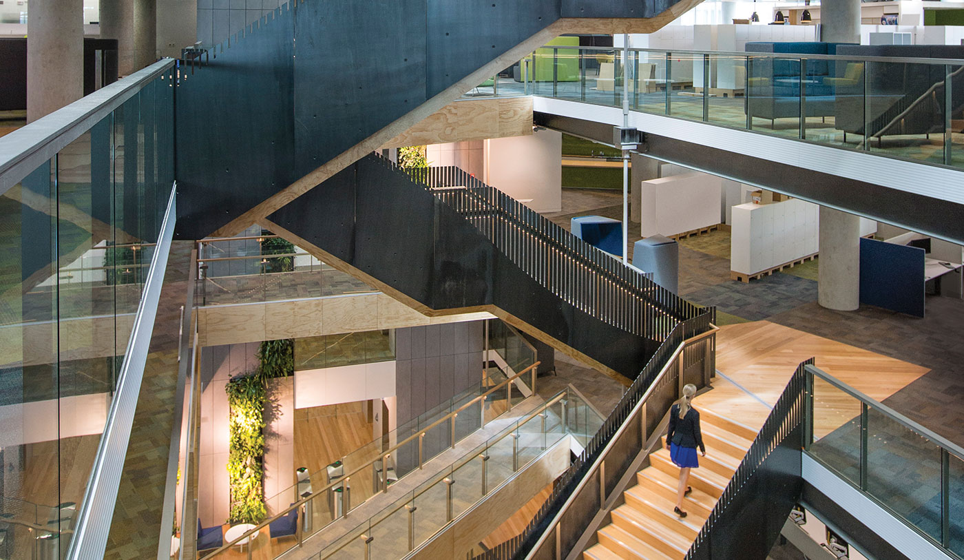 Sustainability is woven throughout the design. A large double-glazed atrium fills the building with natural light, while a variety of workspaces and an internal staircase encourage collaboration across the activity-based work environment. Sustainability features include: