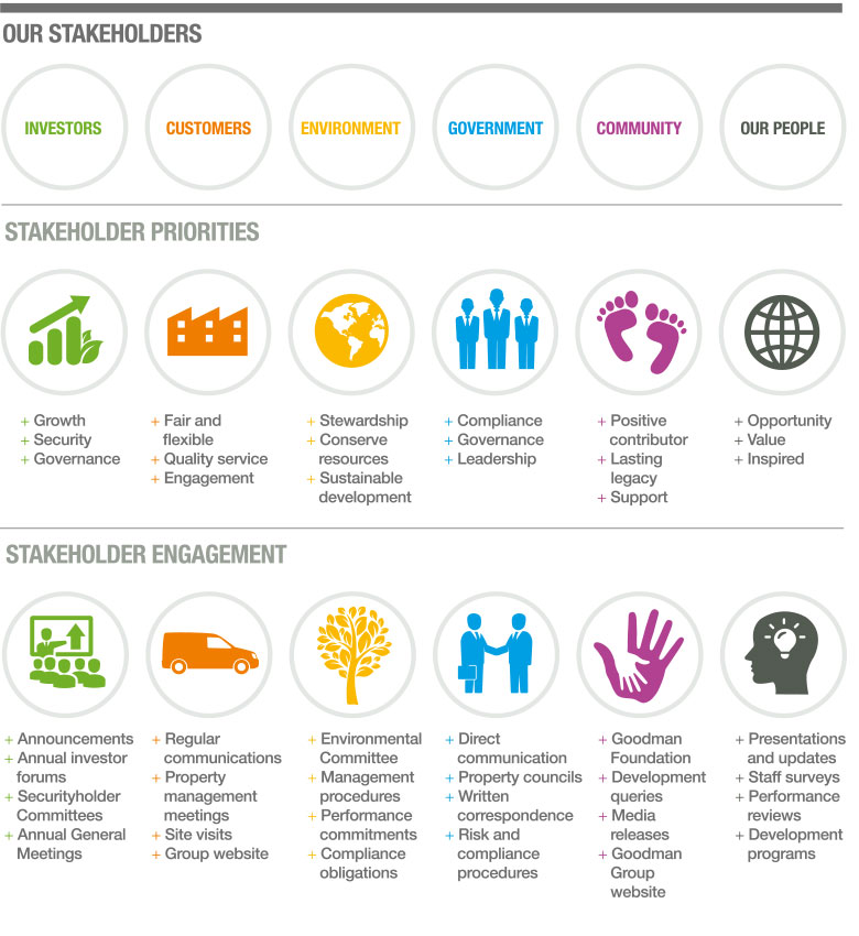 We engage through a range of channels and processes depending on the stakeholder, but typical channels include investor updates and committee meetings, property tours for investors and analysts, property management activities and customer meetings, industry forums and events, and through the Goodman website.